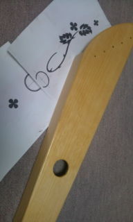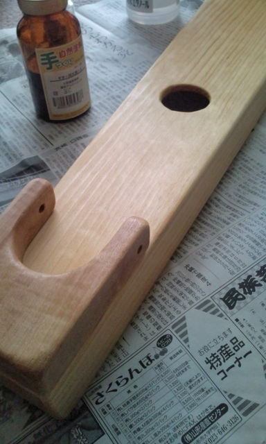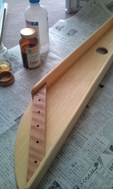 この、白木の手触りが名残惜しいんですが、この材はとても柔らかいです。なるべく強度を確保して永く持っていられる楽器になってもらうためには致し方ないです。ワックスもいいかもしれませんが、ちょっとぶつけて凹む繊細さが心配です。(←そういう心配をしないといけない自分が悲しい 笑)
