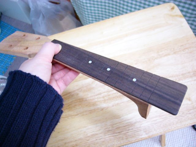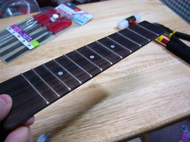 あんまり凝ったことをするのは難しいから、これでよしとしまス。指板って、結構柔らかいんだなあ。もっと硬い材なのかと思ってました。ヤスリをあてるとさくさくとキメ細かく削れる。(←調子に乗るとアブナイ)