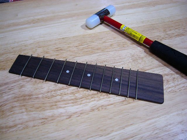 次に、フレット線を指板に打ち込みました。