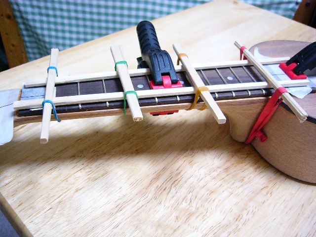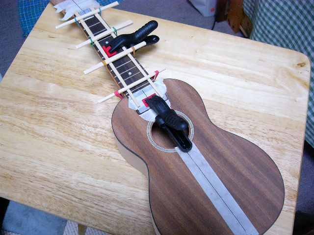 タイトボンドをつけてぺとvっとネックに板~置いたはいいものの、