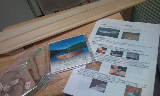 説明書、木材、チューニングハンマー、チューニングピン、弦(予備つき)、補強の木材、ポンシ(弦をささえる部分。ギターならブリッジに相当するのかな?)。それから、初心者用の教則DVDが楽譜2曲つきで。コレは同梱していただきました。キットは15000円。DVDは1000円。